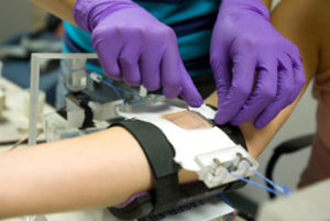 - In Vivo Tape-Stripping Experiments: To examine the effects of stretching on transport through skin, we conduct in vivo studies on human participants. Using a stretching apparatus designed by the research team, we apply either constant strain (fixed displacement) uniaxial extension or constant stress (fixed force) to the forearms of volunteers for the in vivo experiments. We place two drug-saturated patches on each volunteer’s forearm, one on the control (un-stretched) site and one on stretched skin. We then use a technique called tape stripping to remove several layers of the SC and analyze the results to compare transport across stretched vs. unstretched skin.